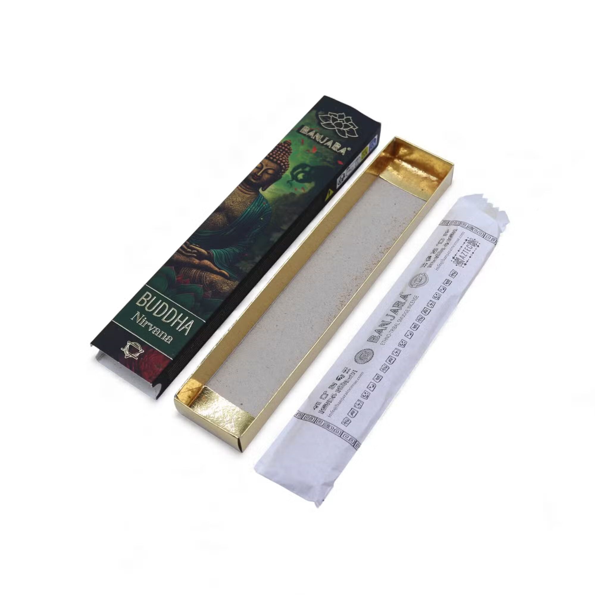 Banjara Buddha – Nirvana A fragrance created to inspire peace, reflection, and a sense of spiritual fulfilment. Nirvana incense transforms your space into a sanctuary for meditation and inner balance. Made in India from natural ingredients, these incense sticks burn slowly, releasing a rich, grounding aroma that lingers beautifully. Perfect for meditation, yoga practice, or simply relaxing at home, Nirvana helps transform any room into a sanctuary.The beautiful packaging featuring Buddha artwork makes it giftable as well as practical, appealing to both incense lovers and those exploring mindfulness or spiritual rituals.Whether for daily rituals, quiet evenings, or moments of reflection, Banjara Buddha Nirvana incense offers a meaningful way to add fragrance and serenity to your space.