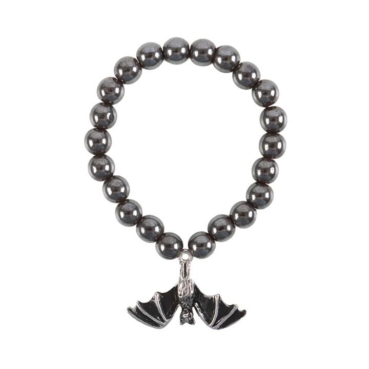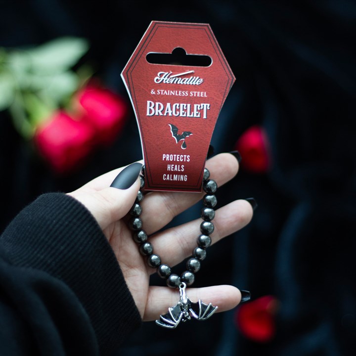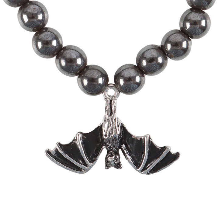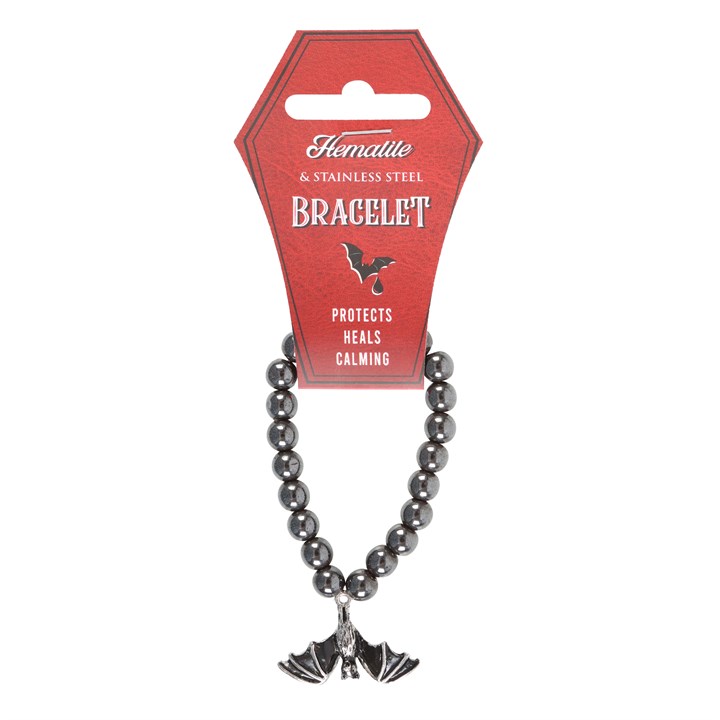 This gothic bat bracelet makes a unique piece to add to any jewellery collection. The hematite beads offer grounding energy, while the exquisitely detailed, stainless steel bat charm adds a touch of mystique. Presented on a matching tag.