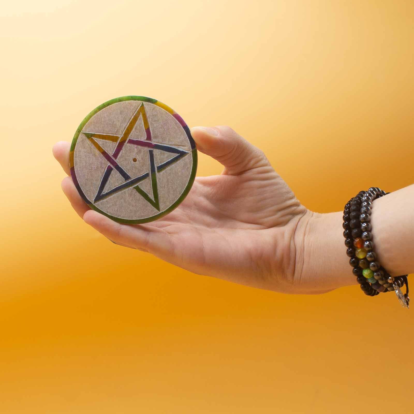 Soapstone Disc Incense Holder – Pentagon- a captivating and spiritually enriched accessory designed to enhance your meditation and relaxation rituals while adding a touch of elegance and symbolism to your space. This incense holder features a striking pentagon shape, a symbol often associated with harmony, balance, and protection. Its presence in your space not only adds aesthetic beauty but also conveys profound meaning. The Soapstone Disc Incense Holder – Pentagon securely holds your incense and evenly distributes their fragrant aroma.Soapstone has a rich history in various cultures and is often associated with spirituality and healing. Owning this incense holder connects you to these traditions, enriching your spiritual journey. Size: 8 x 8cm
